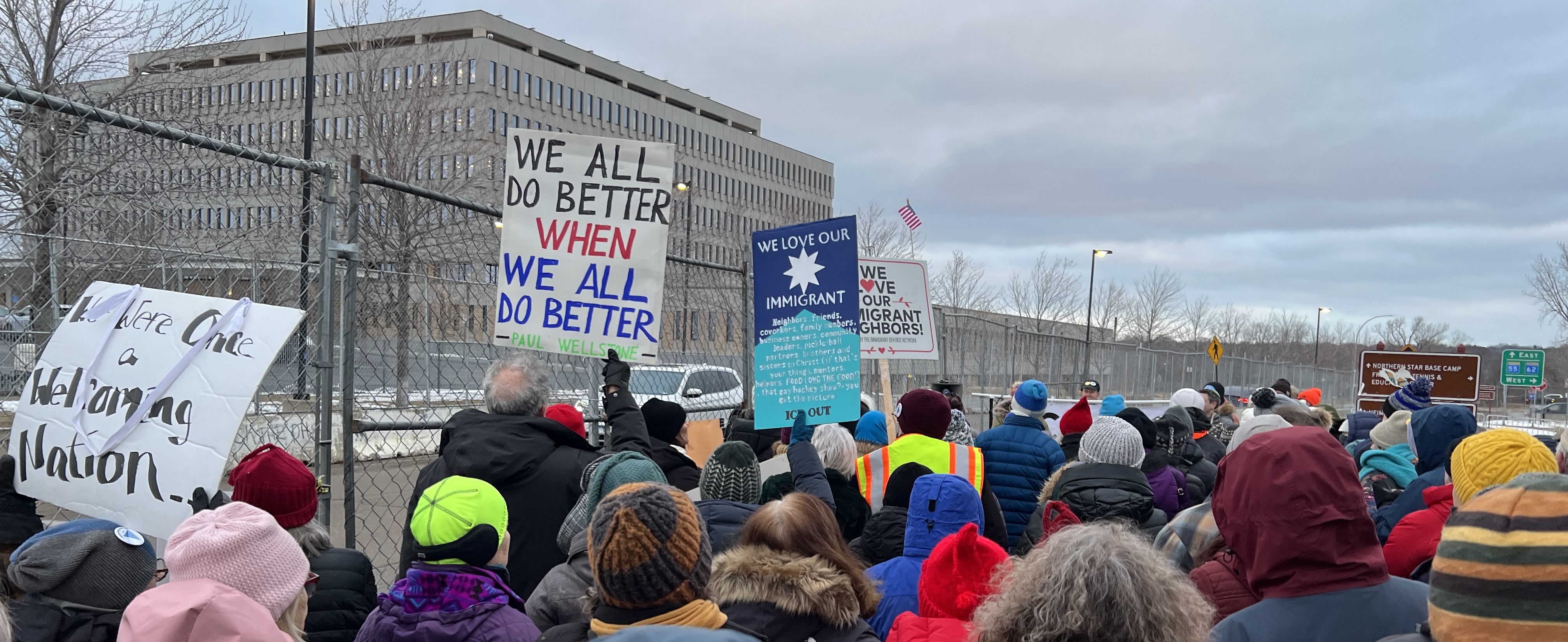 Alex, Mary, and I have for many years taken part in a monthly vigil for our immigrant neighbors at the Whipple Building hosted by ICOM. Alex and I created and manage ICOM’s website and technology. The site of that vigil has become the epicenter of tension here. In fact, the Bishop Henry Whipple Building has become a concentration camp, overstuffed with neighbors who have been abducted from our streets and are now being mistreated in our midst. This building, named after an advocate for Native Americans who begged clemency for a group of Dakota to be hanged in 1848, is now the site of America’s great shame.